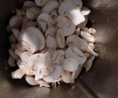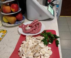 1. 1. Gli ingredienti. Tagliare gli champignon a fette e la salsiccia a pezzi di 4 cm l'uno.