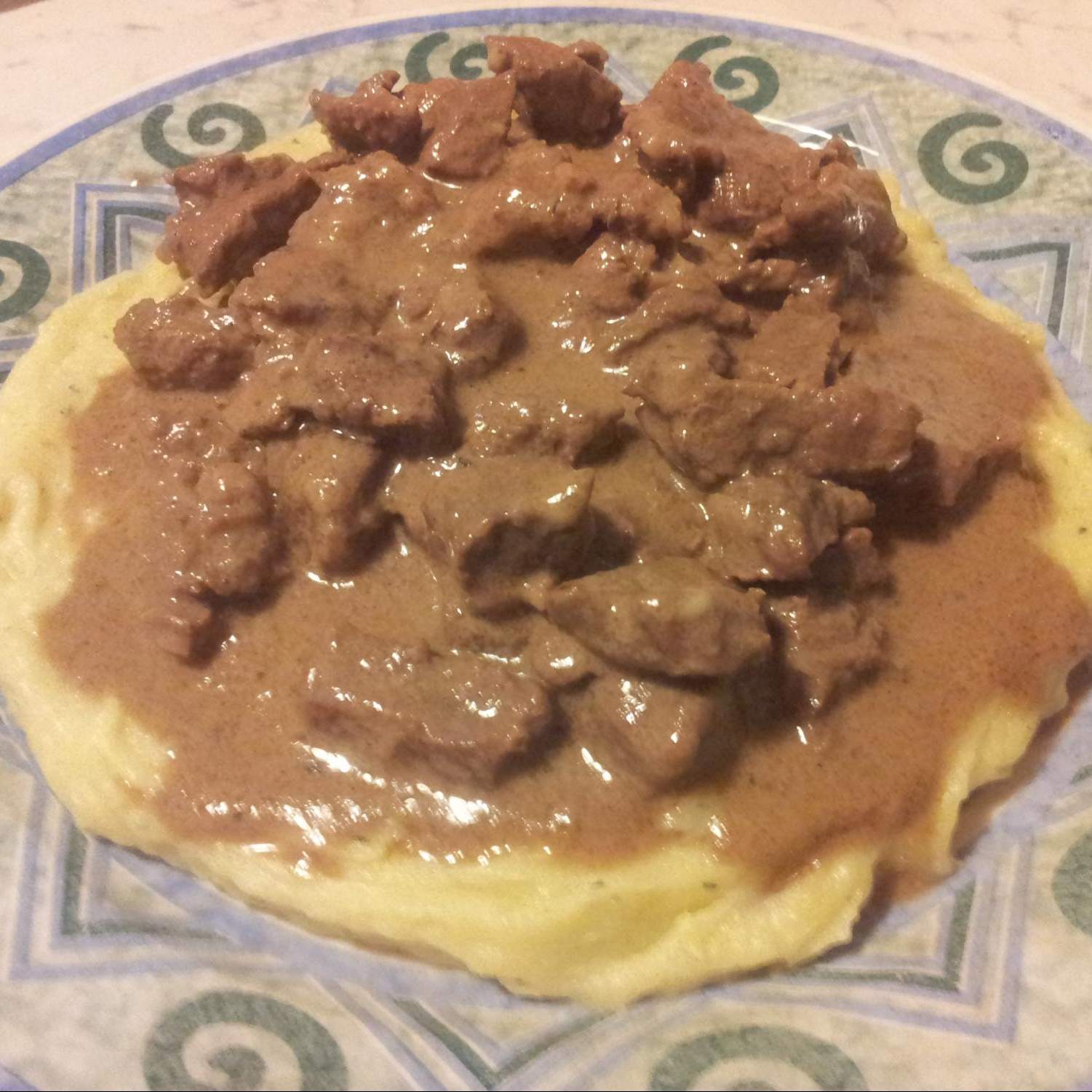 3. Adagiare il purè su un piatto da portata, versare sopra lo spezzatino e servire caldo.