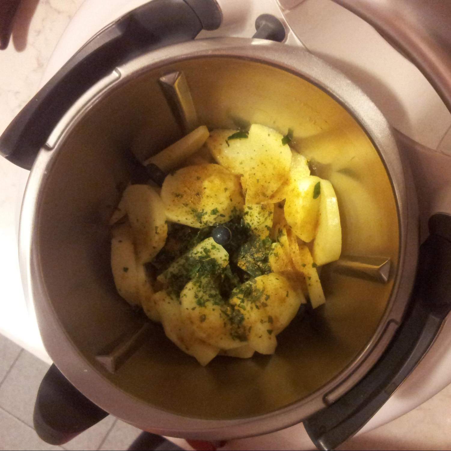 "coperchio chiuso" le patate sbucciate e tagliate a fettine, il sale, lo zenzero, il latte e il basilico tritato e cuocere per 25 min 95° vel 2 (posizionando il cestello sul