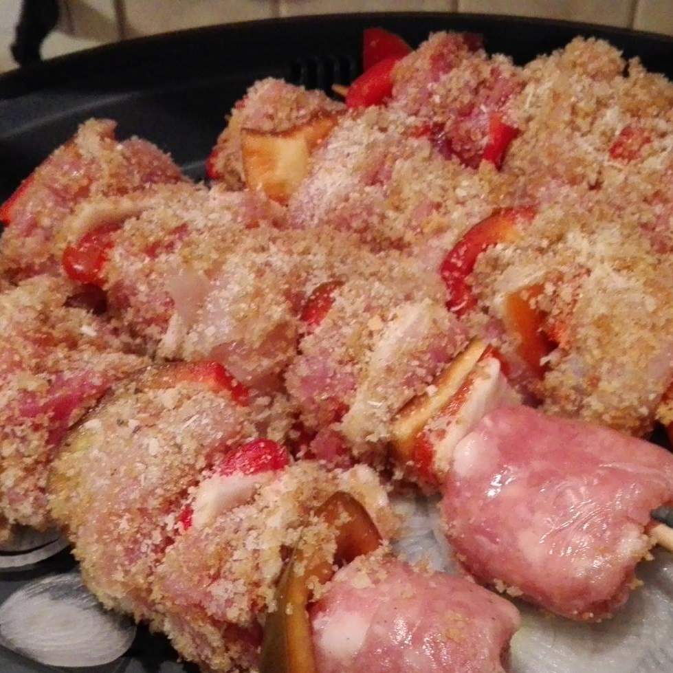 "coperchio chiuso" il pane, le olive, i capperi 20 da vel 4 a vel. vel 9.Disporre in un vassoio..Oliare i pezzi di carne ( che dovranno essere delle stesse dimensioni) e passarli nel pane.Tagliare il guanciale e il peperone a quadretti