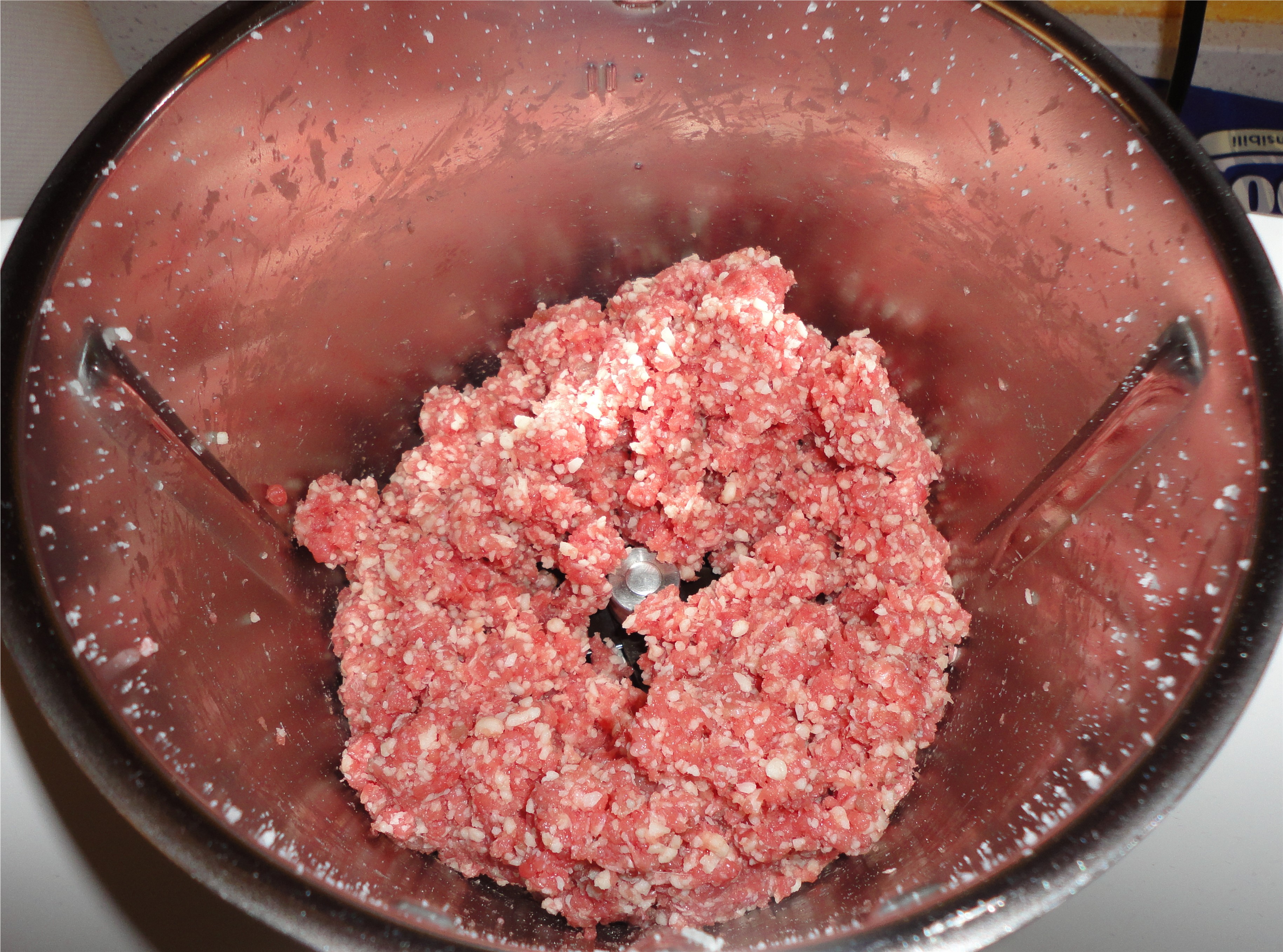Nel boccale tritare il provolone 10 sec. Vel. 8 mettere da parte. Tritare il pezzetto di cipolla 3 sec. Vel. 7 unire la carne trita, sale, pepe e il formaggio e amalgamare 10 sec. Vel. 5.