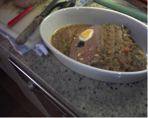 Scottate e spellate i pistacchi, preparate le olive e unite all’impasto. Tritate sedano carote cipolle ecc. a Vel. 7 unite 60 gr.di olio e soffriggete per 5 min. 100° Vel. 1, togliete dal boccale e lavate il boccale con gr. 100 di vino bianco secco, che unirete al soffritto, ponete il tutto in una pirofila da forno. Salate internamente la tasca, riempite cucite e legate bene inserendo fra il ripieno le uova sode. Sistemate la tasca nel Varoma. Inserite nel boccale gr. 700 di acqua, posizionate il Varoma e cuocete per 1 ora e mezzo temp. Varoma, AVENDO CURA DI AGGIUNGERE ACQUA NEL BOCCALE DOPO 30 MINUTI. Sistemate la tasca e il sughetto prodotto nella pirofila da forno e infornate per circa 30 minuti a 200° avendo cura di irrorare e girare spesso. Tagliate a fette quando si sarà leggermente raffreddata, lasciando in caldo il condimento. Servite accompagnando con verdure in agrodolce, cipolline peperoni o una bella insalata mista.