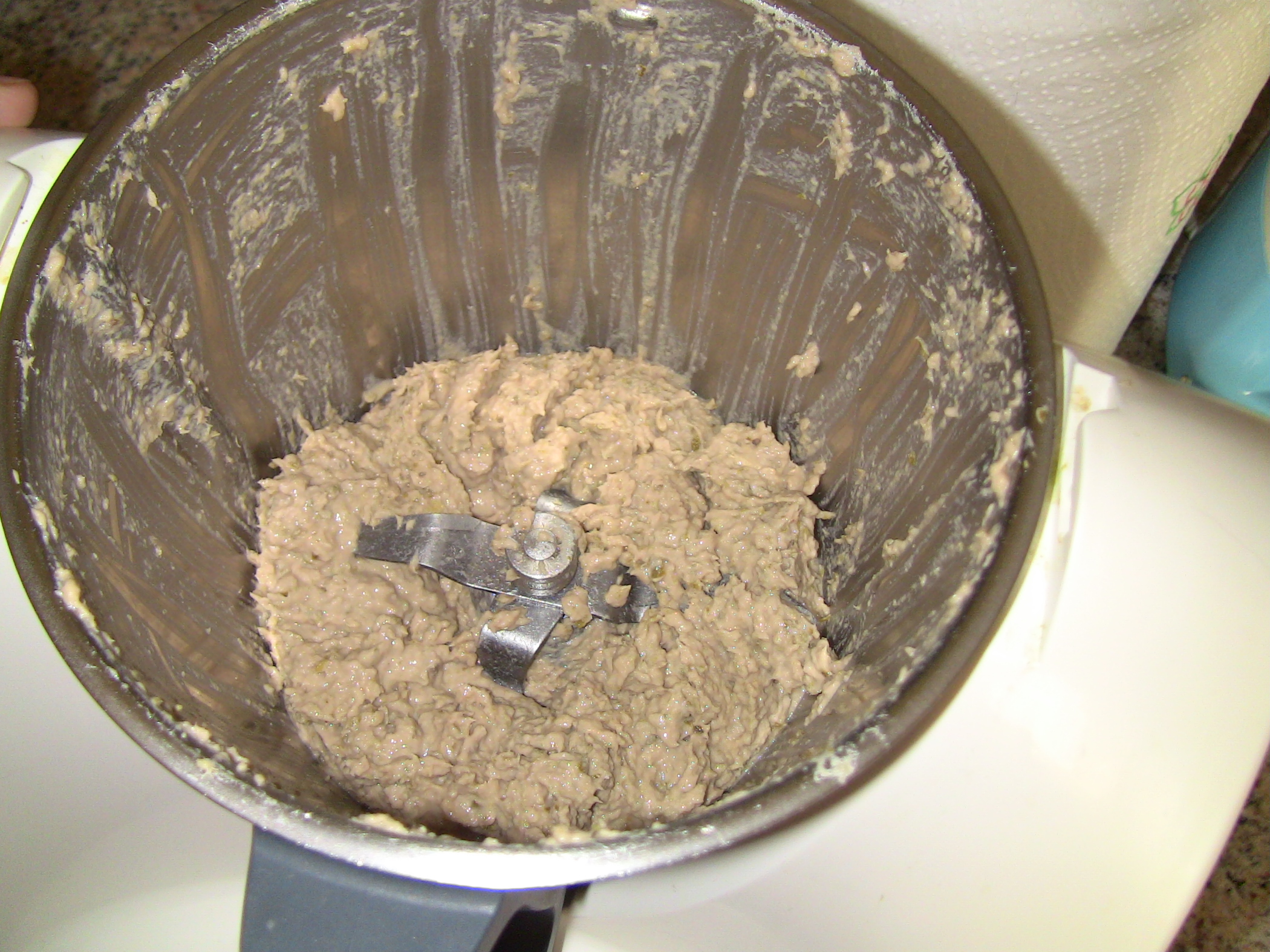 "coperchio chiuso" il tonno sgocciolato, i capperi e le acciughe e tritare a vel. 5 per 20 sec. Riportare l'impasto sul fondo e ripetere l'operazione 2-3 volte in tutto finchè si otterrà una consistenza cremosa... la consistenza è a piacere.Aggiungere infine la maionese ed amalgamare per 15-20 sec. a vel. 2.