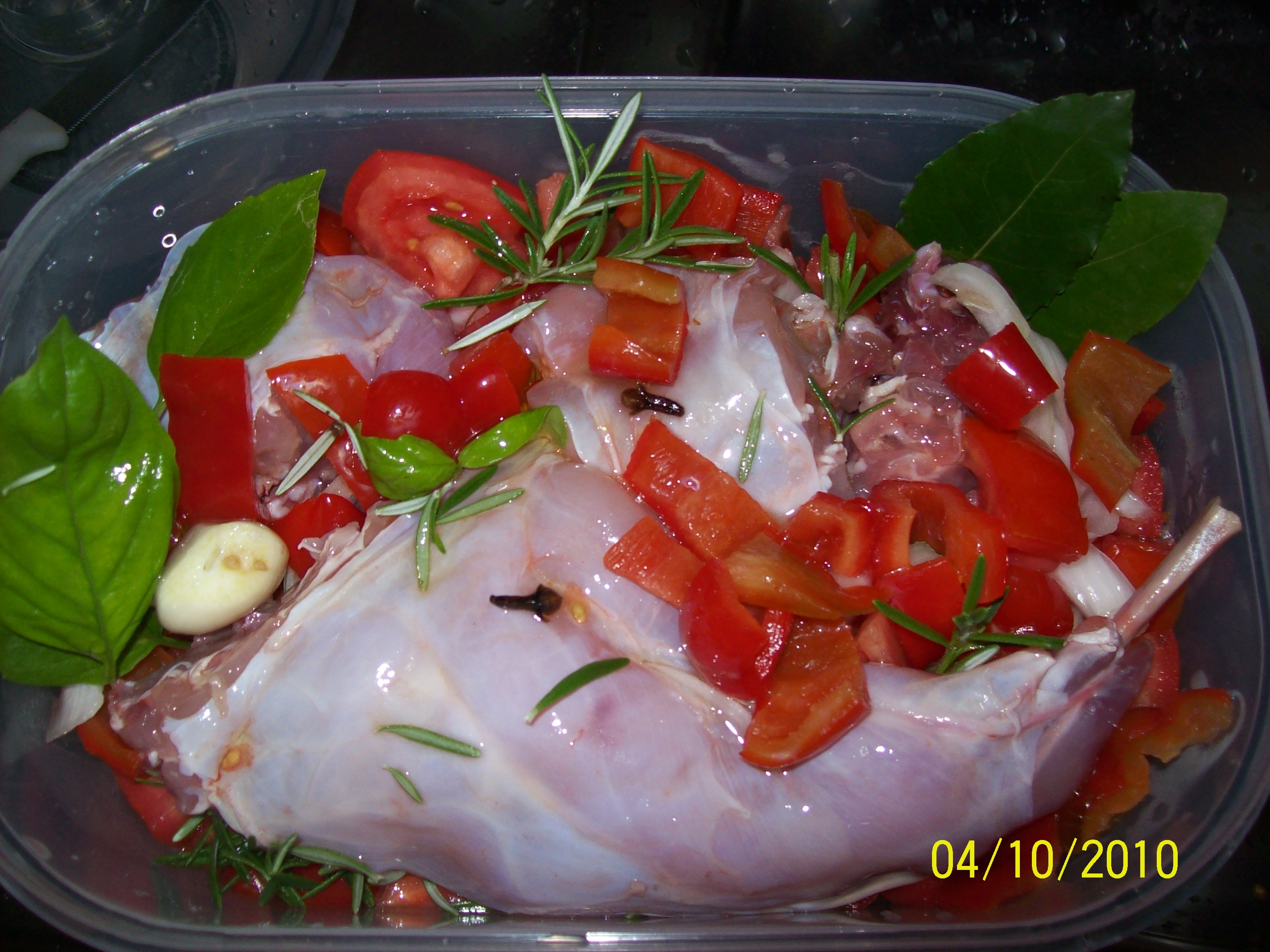 "antiorario" lavare il coniglio in acqua sale aceto mettere in una ciotola con la cipolla tagliata a fette il peperone e i pomodoritagliati a tocchetti le foglie di alloro un rametto di rosmarino l' aglio le foglie di basilico e i chiodi di garofano un cucchiaio di aceto 30 gr di olio mescolare per insaporire e lasciare a riposo in frigo per alcune ore