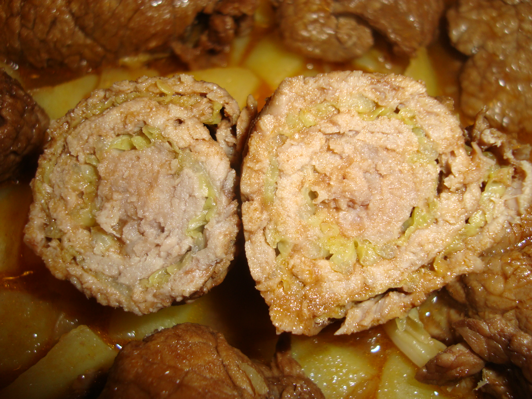 Preparare gli involtini: prendere una fettina ed adagiarvi sopra la verza cruda (solo la parte tenera, senza la costa centrale) e un pezzetto di salsiccia.