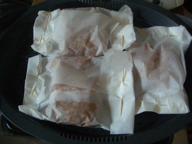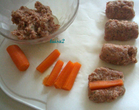 dividere il composto in otto porzioni, in ogni porzione mettere un pezzetto di carota e formare un polpettoncino. Prendere un foglio di carta forno, deporvi un polpettoncino ed avvolgerlo di un giro, deporne un altro e fare ancora un giro, infine metterne un terzo. Chiudere a pacchetto aiutandosi da stuzzicadenti.