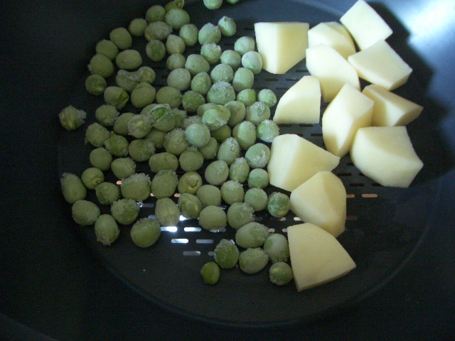 Mentre le carote cuociono, sbucciare e lavare le patate, tagliarle a pezzettoni e metterle nella campana del varoma con i piselli surgelati
