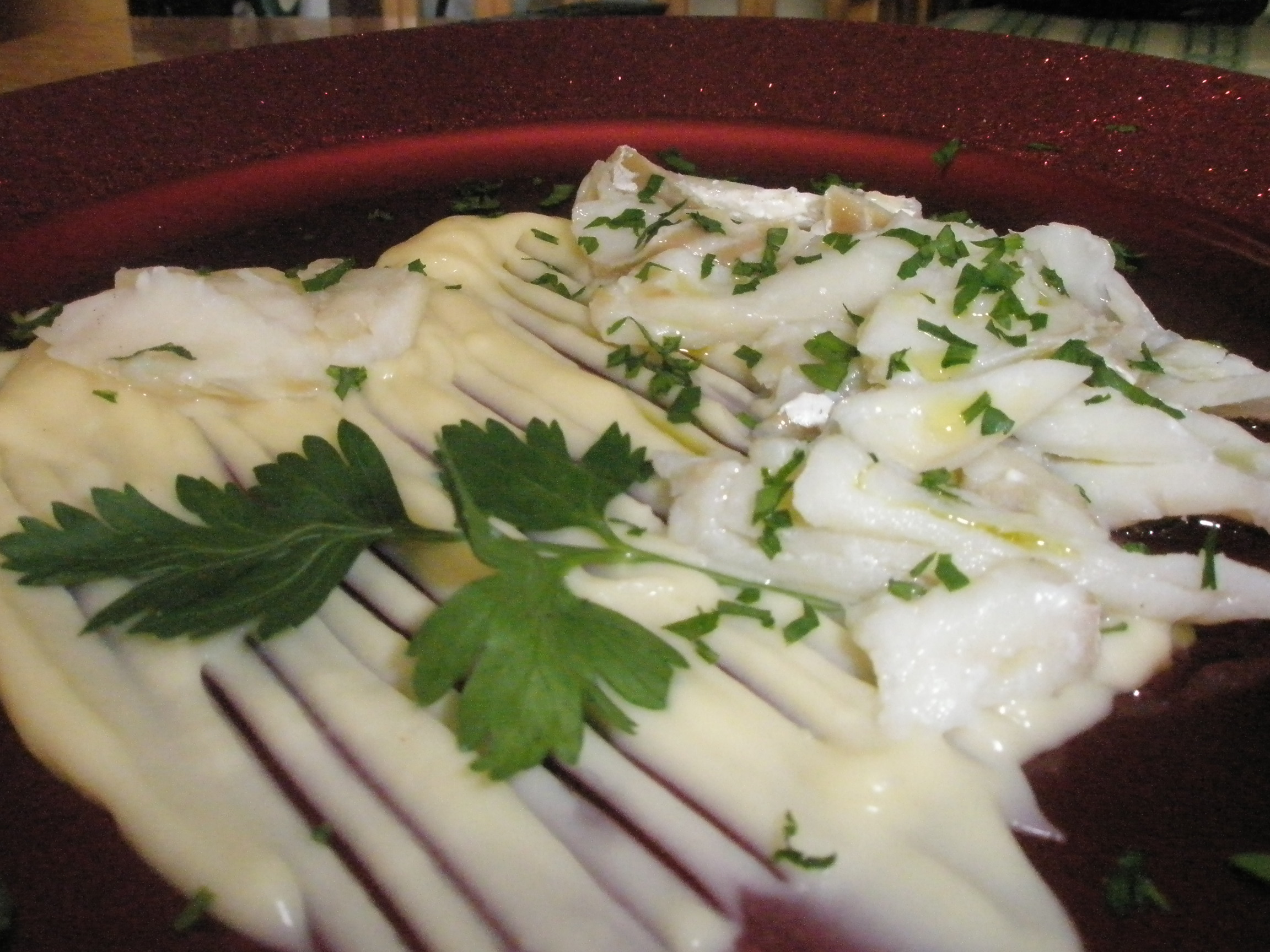 IMPIATTARE IL BACCALà CON LA CREMA, IRRORARE CON UN FILO D'OLIO EVO A LIMONE E SPOLVERARE COL PREZZEMOLO