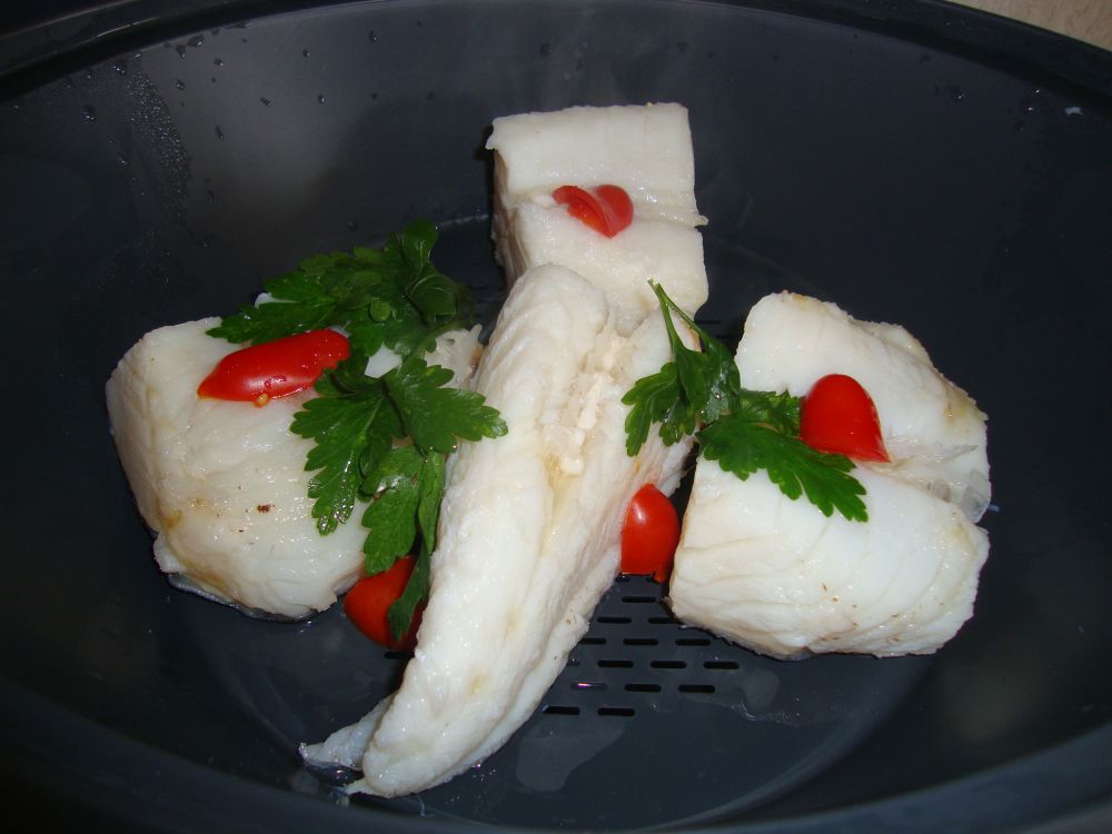 Nel boccale mettere olio, aglio 3 min, 100° vel. 1, aggiungere i peperoni e salare, sul coperchio posizionare il varoma con il baccalà come da foto e cuocere 10 min. temp Varoma vel. Soft-antiorario. Tenere da parte.