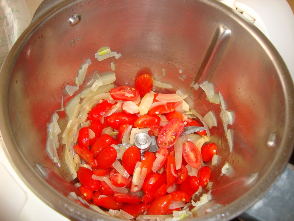 Aggiungere i pomodori e cuocere 5 min 100° vel 1