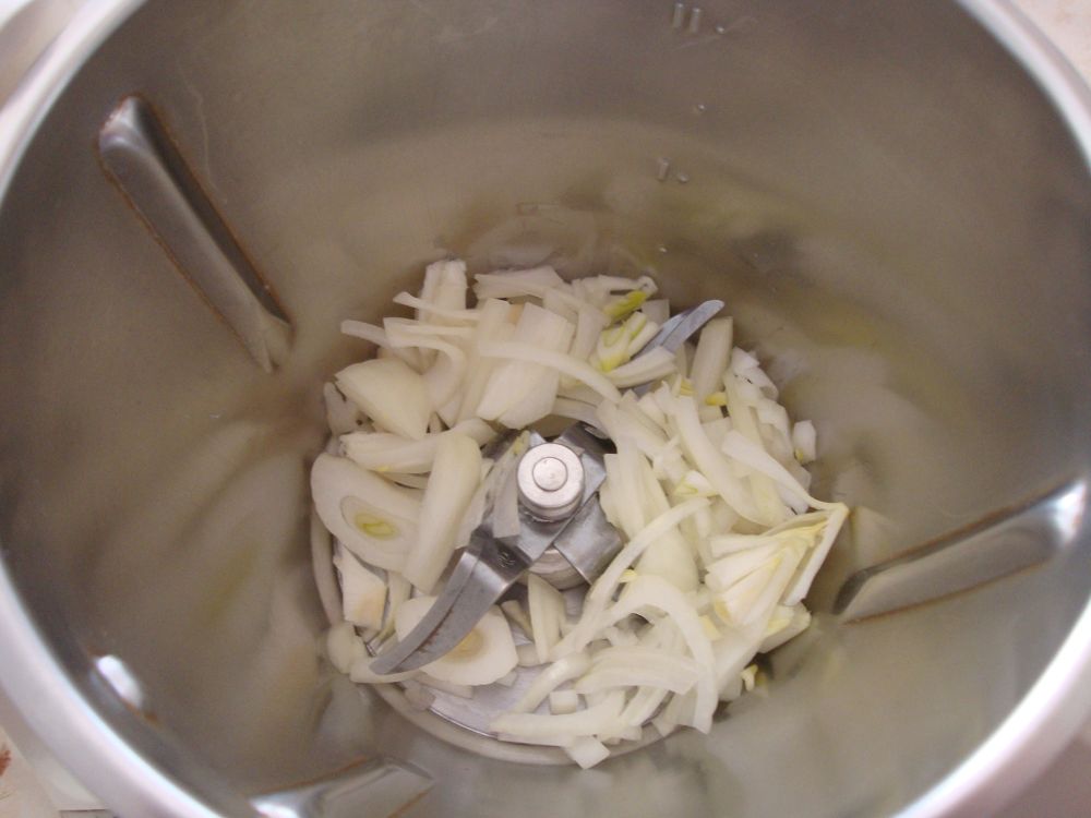 Tritare la cipolla 4 sec. vel. 5, aggiungere l’olio , il peperoncino e rosolare 5 min. Varoma vel. 1. Sfumare con il vino 2 min. temp Varoma vel. 1.