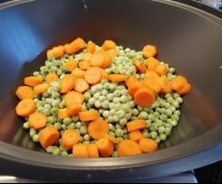 Profumo anche l'acqua con qualche fogliolina di salvia fresca e un rametto di rosmarino! - Sistemo nel recipiente del varoma i piselli surgelati e le carote tagliate a pezzettini.