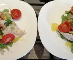 Sistemo un pochino di rucola leggermente condita con sale e pepe sul fondo del piatto, unisco sopra il pesce con tutti i suoi profumi, condisco con metà dell'emulsione all'olio preparata all'inizio della ricetta e il gioco è fatto!