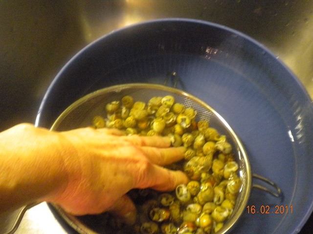 Dopo aver ben bollito le lumachine, scolatele e nella ciotola, con l'aiuto di un colino grande, sotto l'acqua calda, strofinatele violentemente per far staccare la linguetta nera che sta sulla testa della lumachina.