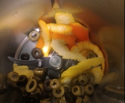 "coperchio chiuso" le olive, i capperi, le bucce di limone e arancia. Tritare per 10 sec vel 6. Unire 30 gr di olio evo. il sale e il succo di arancia. Emulsionare per 10 sec vel 4. Posizionare i filetti di merluzzo nel varoma (recipiente e vassoio) e le patate tagliate nel cestello. - 2. Condire i filetti di merluzzo con la salsa ottenuta. Mettere nel
