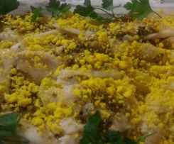 "coperchio chiuso" e posizionare il varoma. - 3. Cuocere per 25 min temp varoma vel 1. A fine cottura posizionare le patate sul vassoio da portata, adagiare i filetti sopra le patate, sbriciolare il tuorlo d'uovo sulla preparazione e condire con un po' di olio evo a crudo. Qualche foglia di prezzemolo per guarnire.