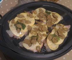 3. 3. Nel frattempo ungere con un po' d'olio il vassoio e il recipiente del varoma. posizionare i filetti di orata, salare e mettere sopra le fettine di patata (3 per ogni filetto), le foglioline di prezzemolo e condire con un filo d'olio. Affettare con l'apposito strumento il tartufo sulla preparazione, pepare.