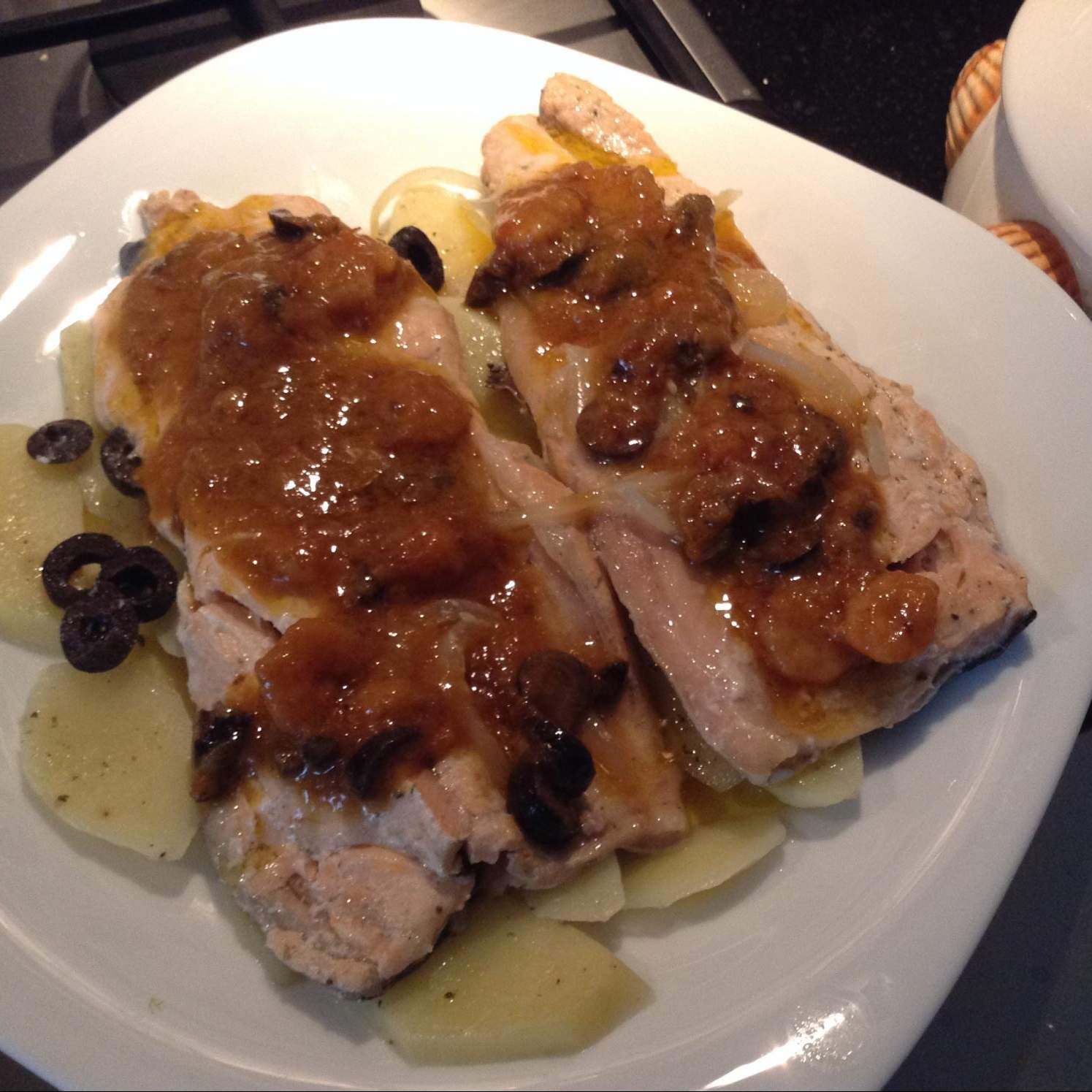 6. Preparare un piatto da portata e disporre le patate, poi i filetti di trota con la cipolla e le olive, bagnare il pesce con un po' di sughetto del cartoccio, completare versando infine, sopra i filetti, il sughetto alla marinara con pomodoro, capperi e gamberi..