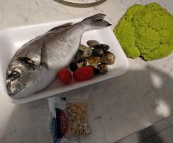 Filetto di orata con vongole veraci e pesto caldo di cavolfiore verde