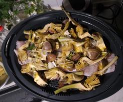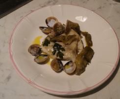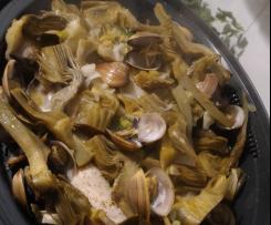 5. 5. Dividere il filetto in 4 parti, impiattare e condire con i carciofi e le vongole. Terminare la preparazione con un filo d'olio evo. Servire caldo.