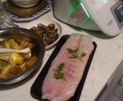 3. 3. Posizionare sul vassoio del varoma il filetto di persico, le vongole, i carciofi, il cipollotto e il prezzemolo. Condire con un po' di sale, una grattata di pepe e un filo d'olio.
