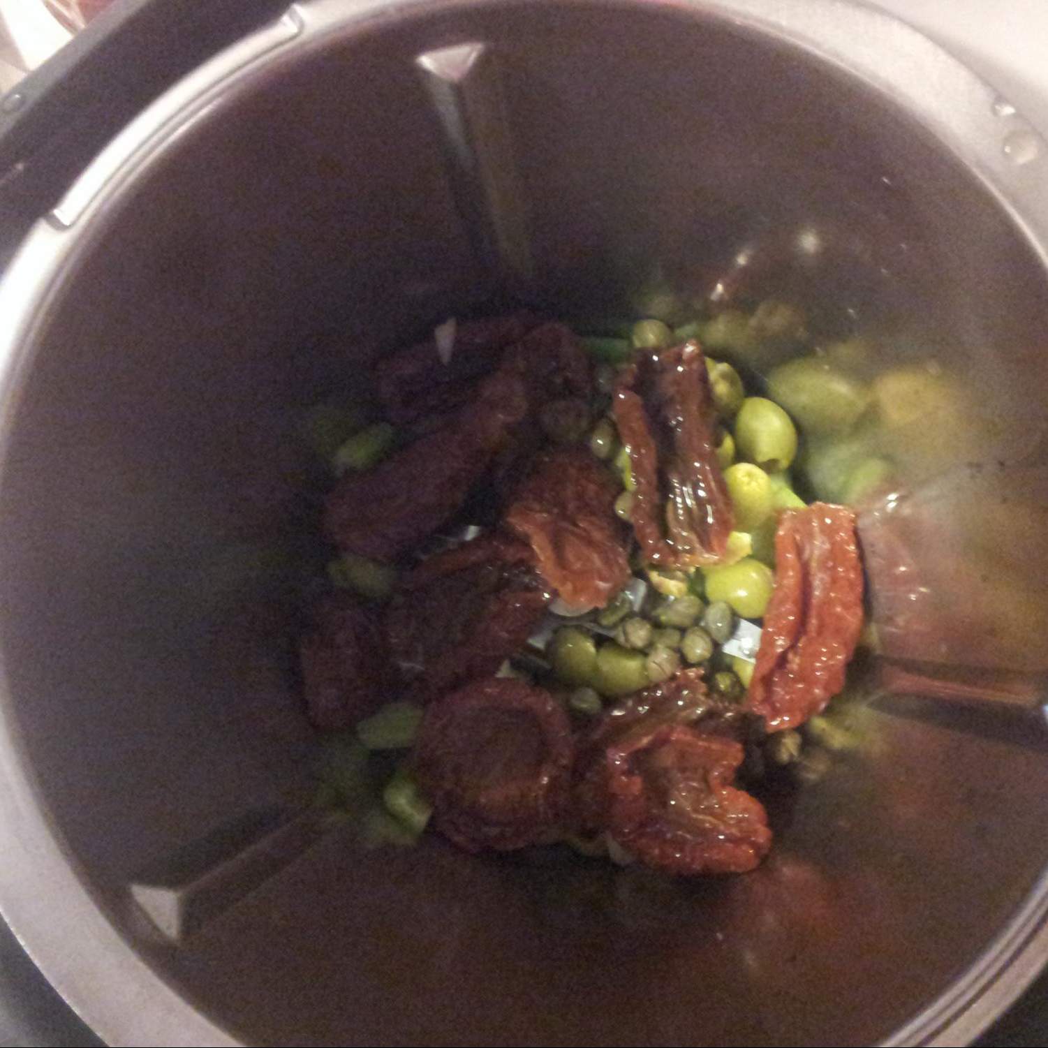 "coperchio chiuso" Tutti gli ingredienti (eccetto l'olio) e tritare per 20 sec vel 5. Aggiungere l'olio e mescolare per 10 sec vel 4.
