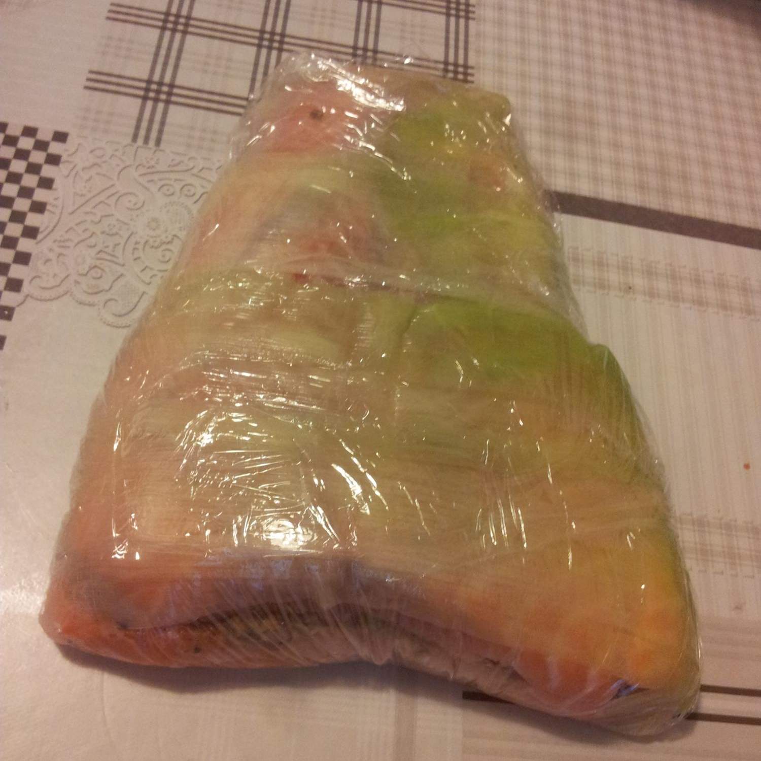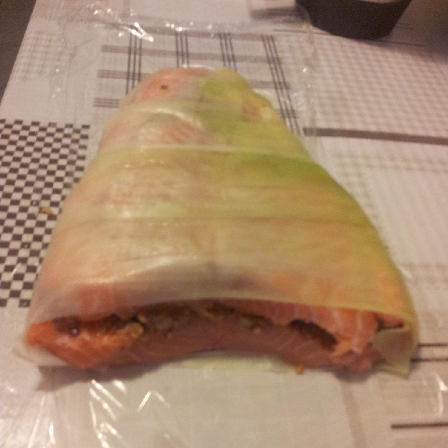 4. Posizionare la pellicola alimentare adatta per la cottura, adagiare le foglie di porro e il filetto di salmone. Stendere in maniera uniforme il ripieno sul filetto.
