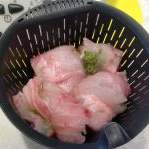 Prendere il filetto di persico, tagliarlo nella larghezza ricavando due fette sottili e ancora ogni filetto nel senso della lunghezza alla fine dovremo avere quattro filetti lunghi e stretti, questa operazione si può chiedere al pescivendolo di fiducia di farlo per noi al momento dell'acquisto se non si ha dimestichezza con coltelli affilati.