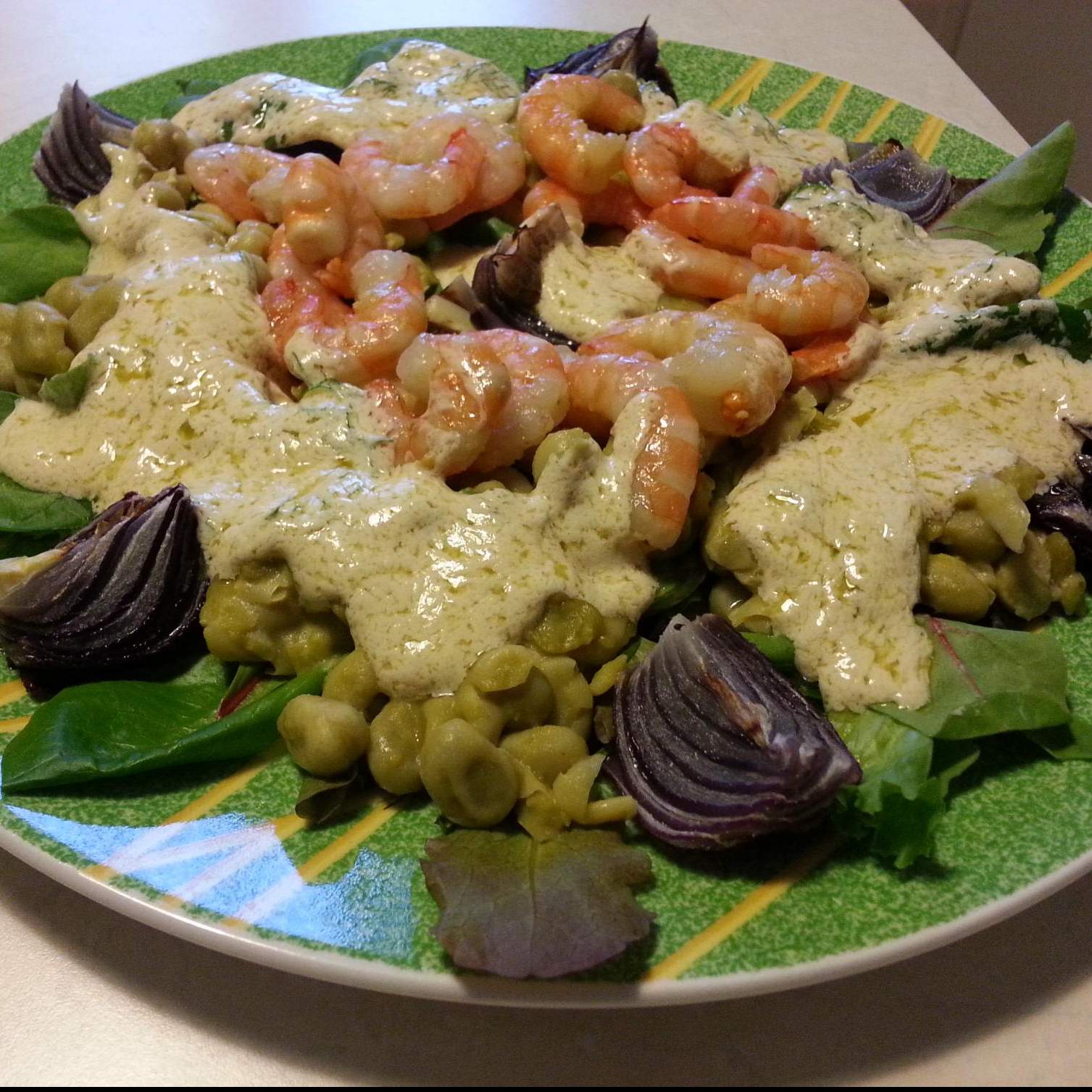 Far scongelare le code di gamberoni in una ciotola con acqua fredda. Pelare le cipolle, tagliarle in quarti e disporle nella teglia del microonde con un filo d'olio e un po' di sale e cuocere a seconda del proprio microonde (io cottura + grill per 10 minuti). In alternativa lasciare le cipolle intere e avvolgerle in alluminio con poco sale e un filo d'olio e cuocere in forno a 180° per 60 minuti circa.