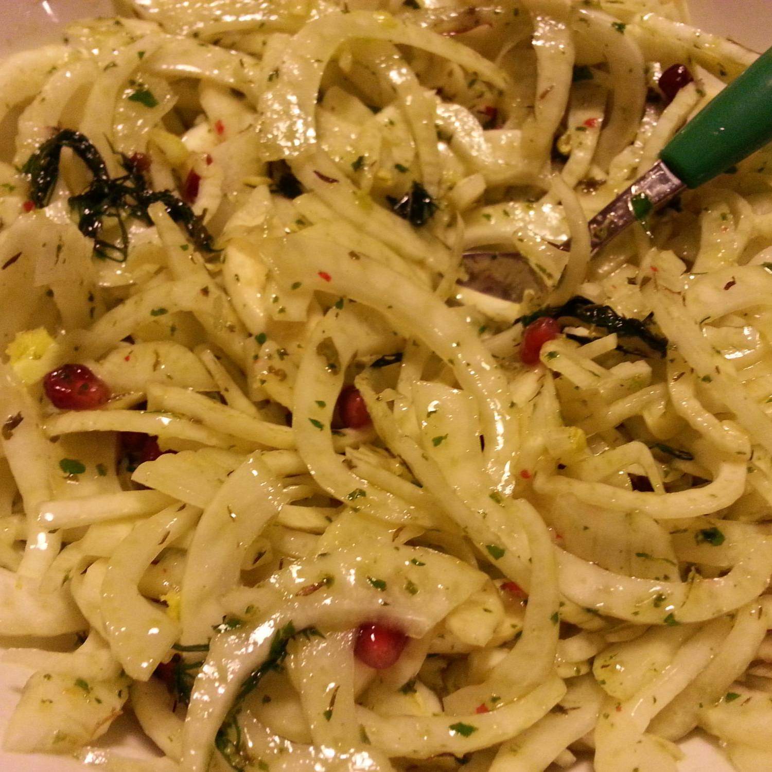 Avevo in casa un bellissimo melograno e dell'aneto fresco molto profumato e ho improvvisato il condimento per condire appunto sia l'insalata di polipo che di finocchio. Il connubio dei vari sapori (melograno, aneto e pepe rosa soprattutto) è delicato ma gustoso al tempo stesso. Ho accompagnato il polipo con un Soave classico ben fresco.