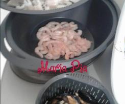 - Mettere le cozze nel cestello, i gamberetti puliti nel contenitore del va roma e i calamari tagliati ad anello nel vassoio.