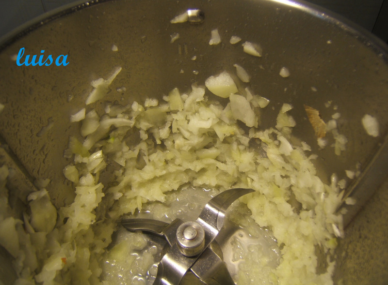 "coperchio chiuso" mettere la cipolla tagliata in 4 e tritarla: 4 sec vel 5, abbassarla sul fondo unire l'olio e cuocere 8 min 100° vel
