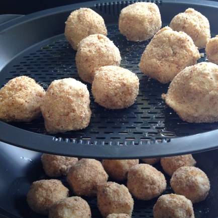 Con le mani bagnate formare delle polpette della dimensione desiderata, passarle nel pangrattato e metterle nei vassoi del varoma leggermente unti di olio.