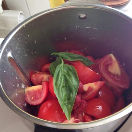 "coperchio chiuso" e metterci la cipolla e un filo di olio. Dare un paio di colpetti a vel. Turbo, agiungere i pomodori ramati tagliati a pezzi, sale, pepe e basilico.Posizionare il Varoma con dentro le polpette e cuocere 15 minuti/Varoma/