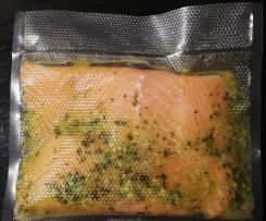 - In un sacchetto per sottovuoto sistemare uno a fianco all'altro i due filetti di salmone e aggiungere condimento al mojito.