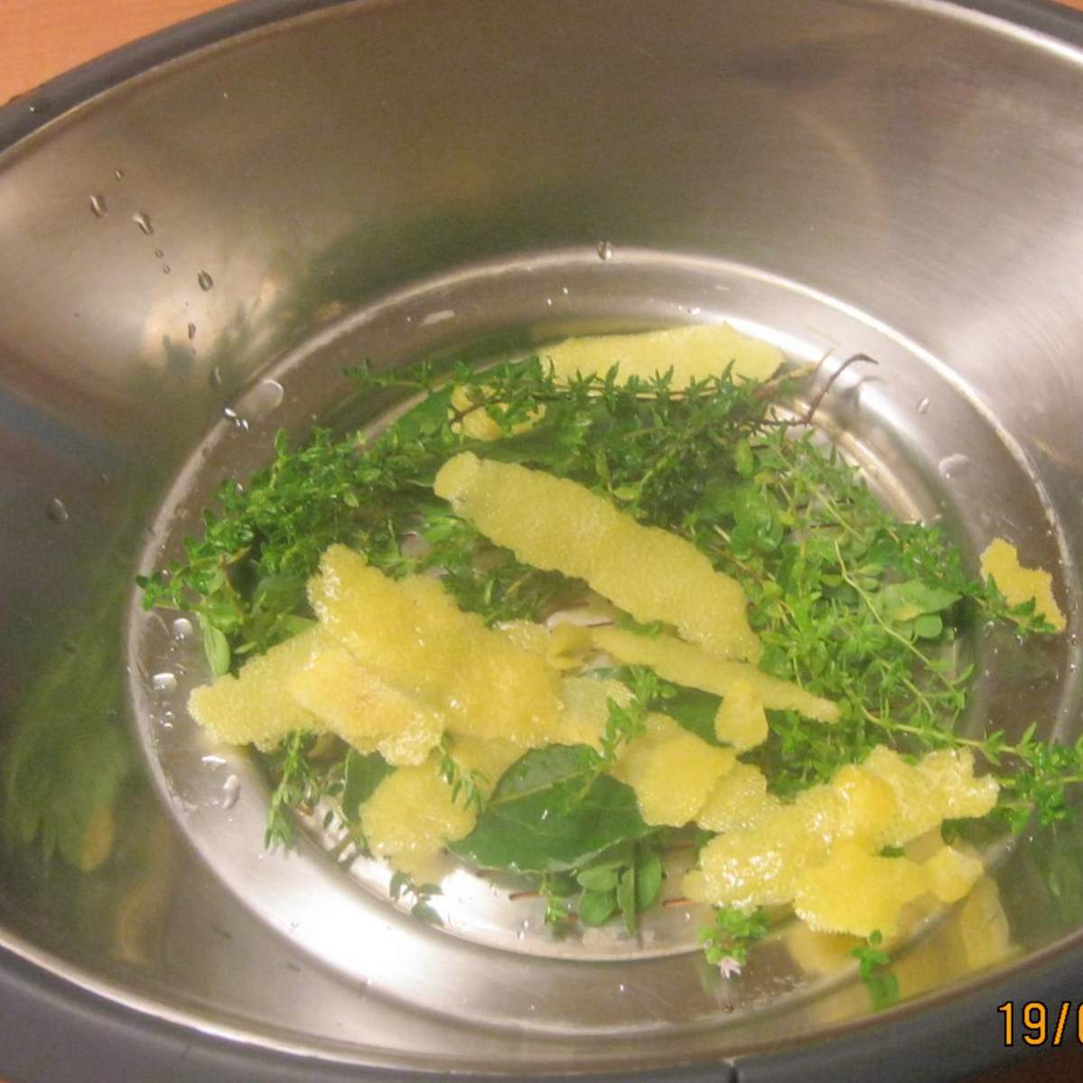Prendere il tonno , lavarlo bene sotto l'acqua corrente per eliminare il sangue.Nel varoma mettere il timo la maggiorana l'alloro e le fette di limone.