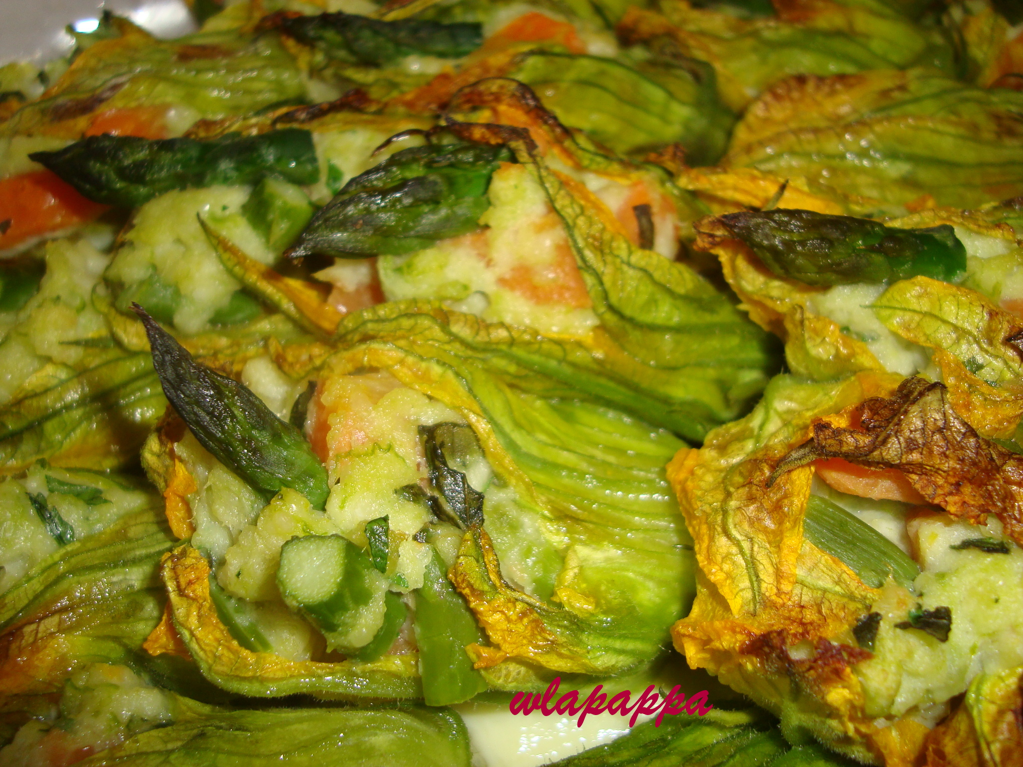 Irrorare con un velo d'olio e cuocere in forno caldo a 200° per circa 20 minuti (quando i fiori di zucca faranno una crosticina).