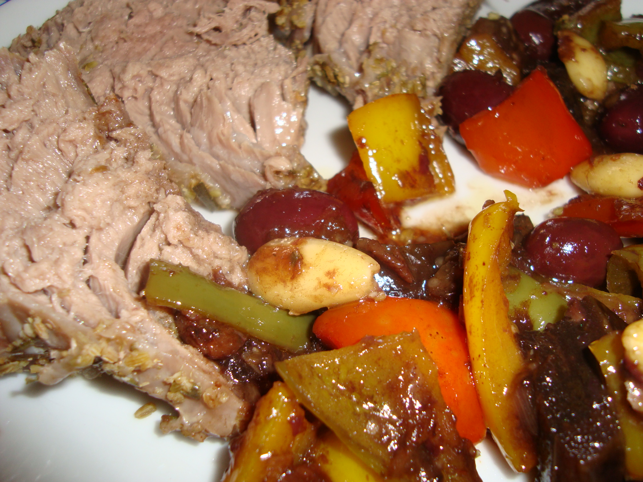"coperchio chiuso" i cipollotti, 2 colpi di turbo, spatolare sul fondo e aggiungere l'olio 3, min. 100° vel.1.Aggiungere i peperoni e le melanzane tagliati a tocchetti, l'uvetta, le olive e le mandorle.Salare, aggiungere l'aceto balsamico, il vino e lo zucchero.