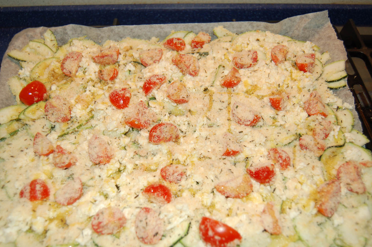 6. Spargere uniformemente la mozzarella sopra le zucchine. Tagliare i pomodorini dapprima a metà, poi in quarti e distribuire anch'essi sulle zucchine coperte di mozzarella.