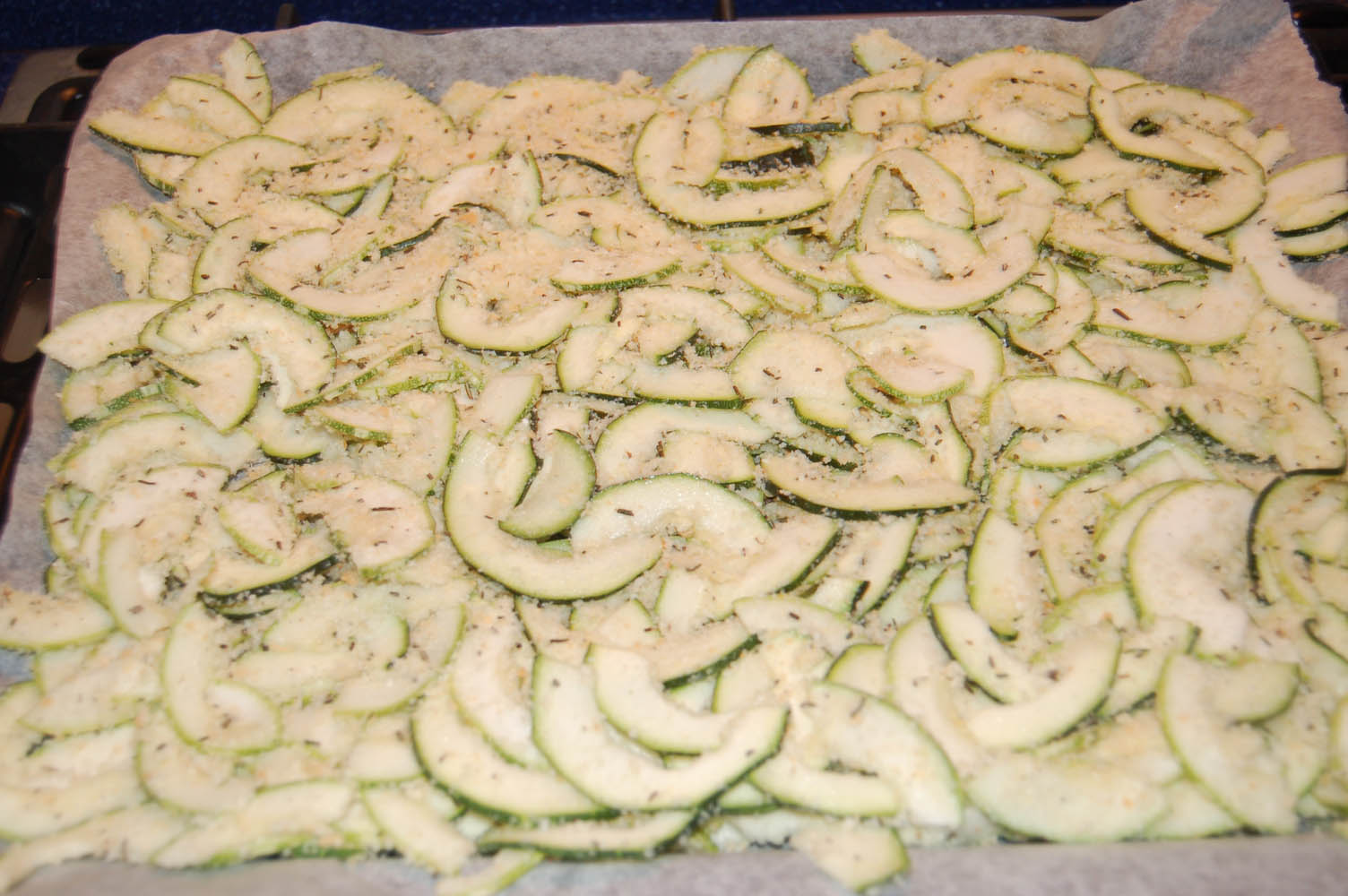 5. Disporre le zucchine su una teglia bella grande (la leccarda del forno è perfetta) ricoperta di carta forno e allargarle bene.