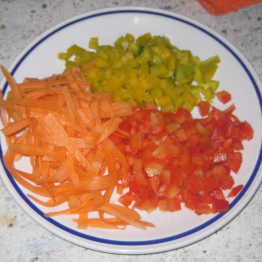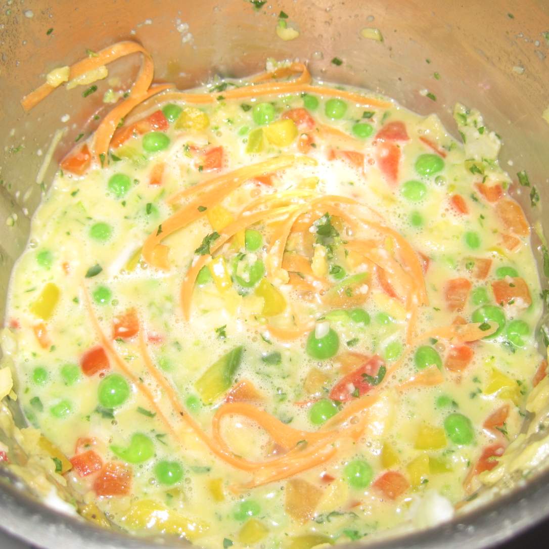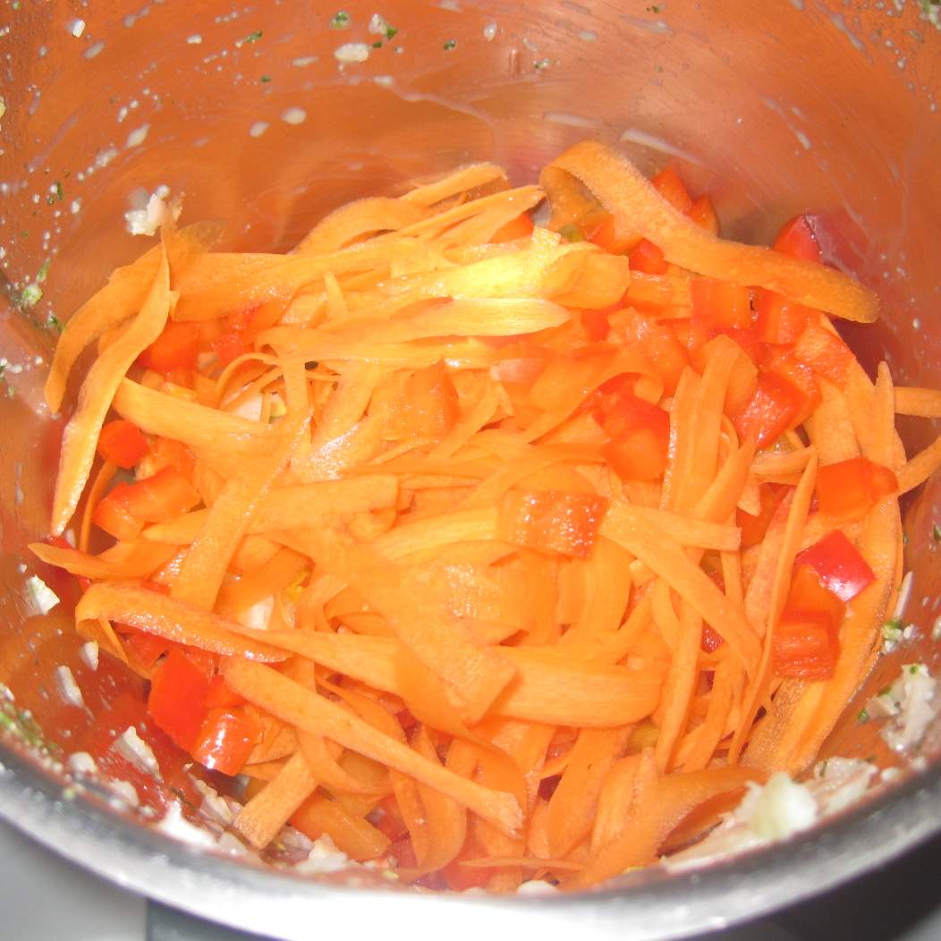 Tritare la cipolla 5" vel. 5, aggiungere l'olio e le altre verdure precedentemente preparate e tenute da parte, i piselli e cucinare 3 minuti - 100° -