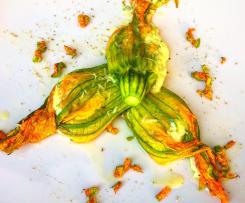 Farcisci delicatamente i fiori di zucca con questo ripieno,richiudili per bene avvitando le punte,quindi disponili in una teglia leggermente oliata,irrora con olio e spolvera con parmigiano grattugiato,cucina forno preriscaldato a 180°C per 13 minuti.