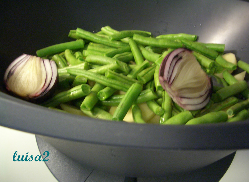 3. Nel coperchio chiuso"coperchio chiuso" inserire l'acqua, mettere nel cestello le uova precedentemente lavate, nel varona sistemare le patate a fettine, i cipollotti e i fagiolini: 15 min Varoma vel 1.