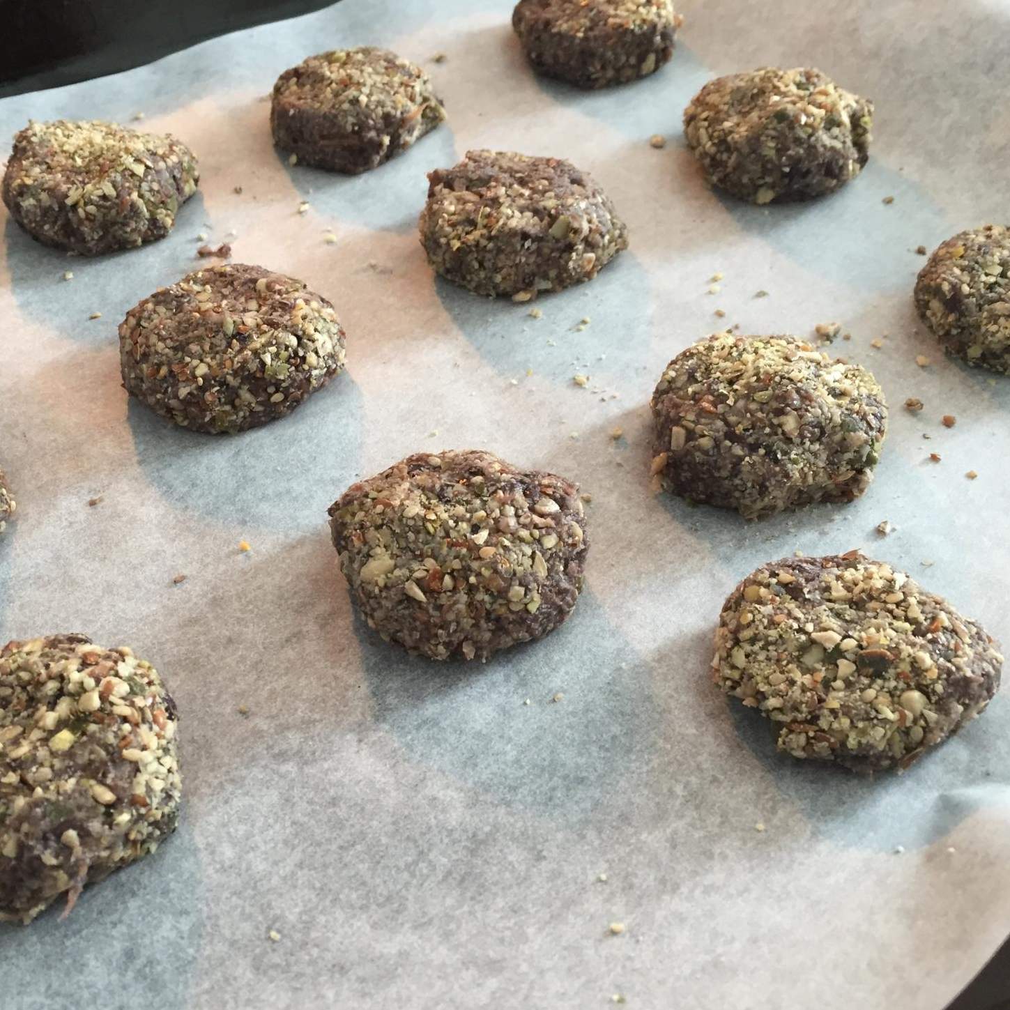 9. Con le mani bagnate creare delle piccole palline d'impasto, schiacciarle leggermente e passarle nel trito di semi.