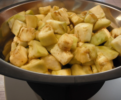 - Spellare le melanzane, tagliarle a cubetti medi, metterle in un colapasta, salarle e lasciarle riposare per 30/40 min.