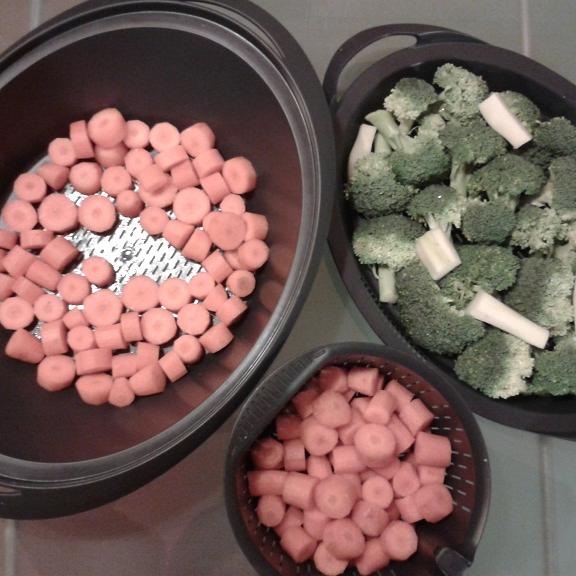 Spuntate e pelate le carote, poi tagliatele a tocchetti e dividetene la quantità un po' nel cestello e un po' nella campana del varoma. Tagliate il broccolo a rosette e pulite il gambo tagliandolo a pezzetti e mettetelo nel vassoio del varoma.