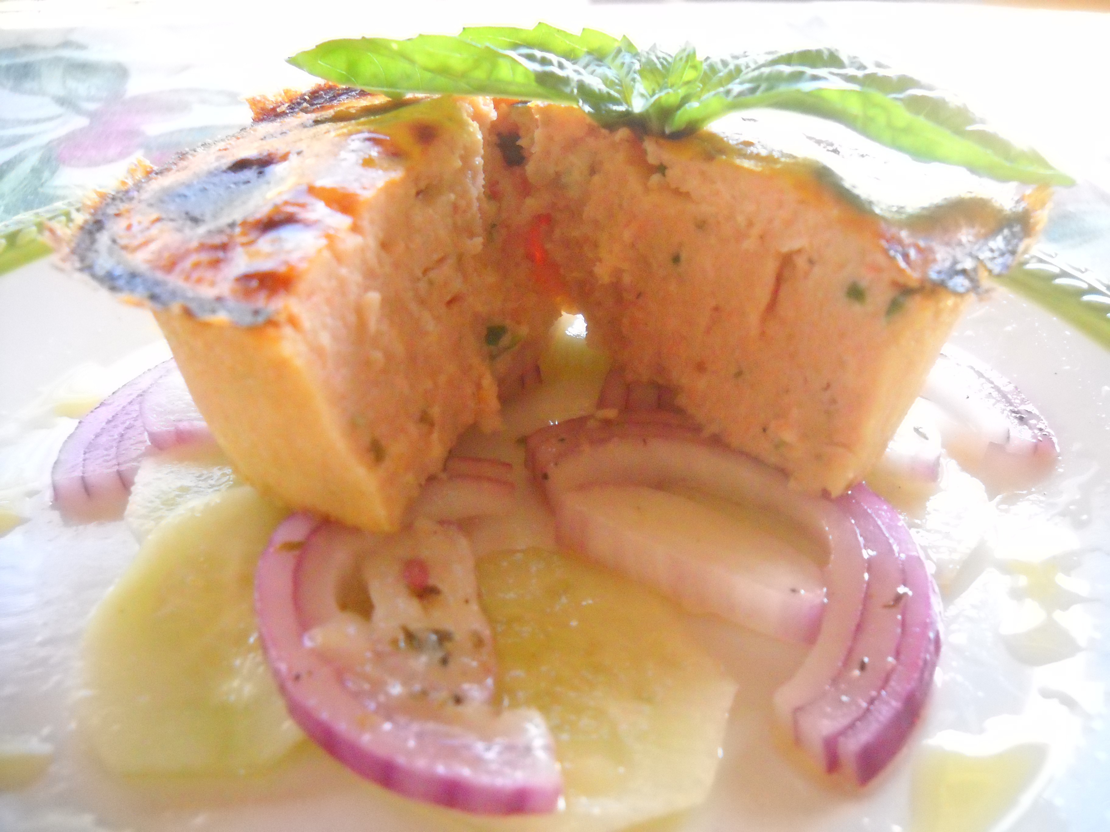 - Preparate la base del piatto mettendo prima i cetrioli, poi le fette di cipolla e infine capovolgete il tortino terminandolo con un ciuffetto di basilico ed un filo di olio.