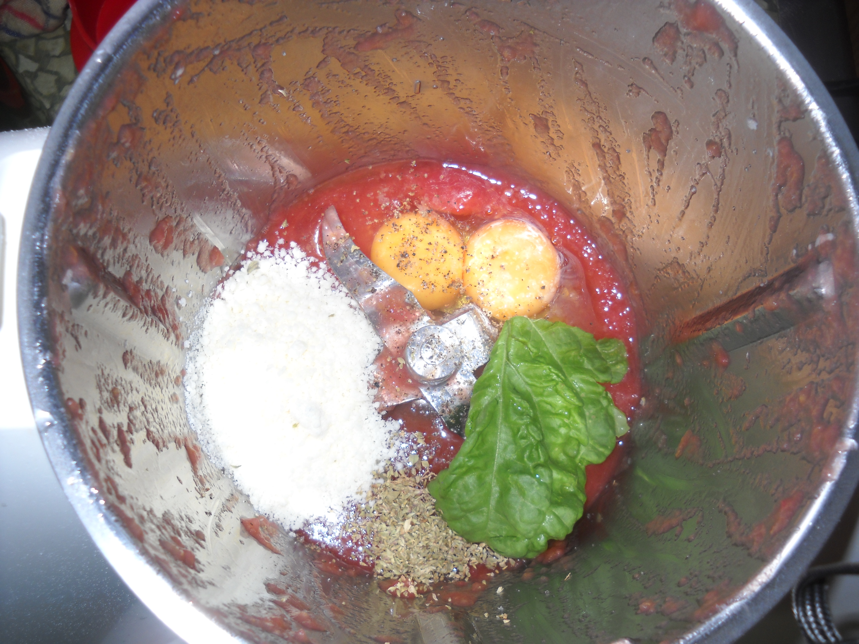 "coperchio chiuso" e frullare 15 sec vel 5; riunire sul fondo e aggiungere le uova, il formaggio gratt. sale e pepe, un pizzico di origano, il basilico e 2 cucchiai di pangrattato 1,30 min vel 4. - Preriscaldare il forno a 200°, spennellare gli stampini di olio e pangrattato versarvi dentro il composto.