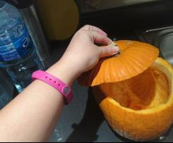 - Lavare la zucca, tagliare la calotta e svuotare la zucca di semi e filamenti aiutandovi con un coltello, facendo attenzione a non forare la buccia;