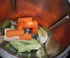 2. Inserire nel boccale il sedano e le carote a pezzi grandi precedentemente pelati col pelapatate e tritare 2 secondi a velocità 5, e mettere in una ciotola da parte;